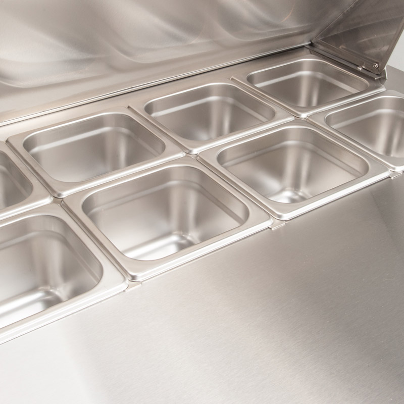 - Especially designed for salad shops and deli restaurants to store diverse food ingredients and a good working table for preparation.